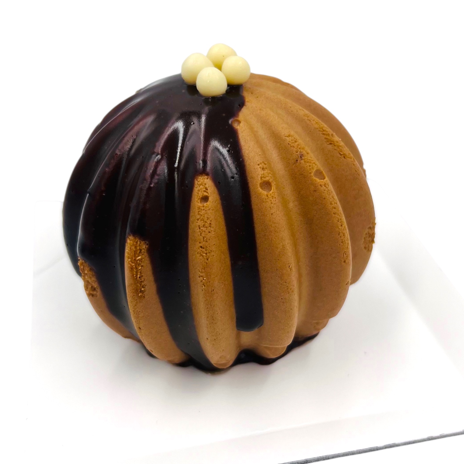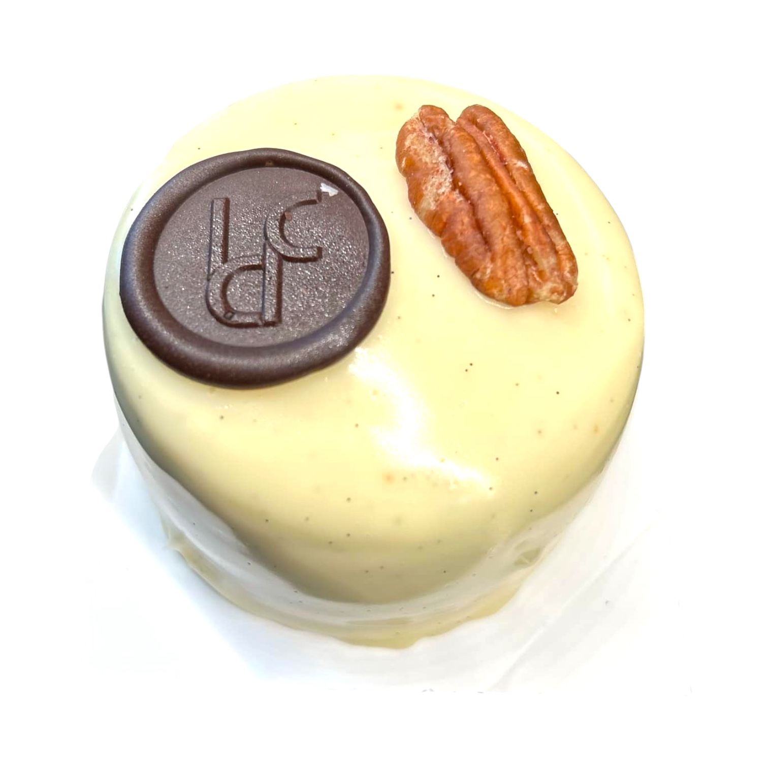 Ganache montée vanille de Madagascar, insert praliné noix de Pécan, praliné noix de Pécan, biscuit vanille