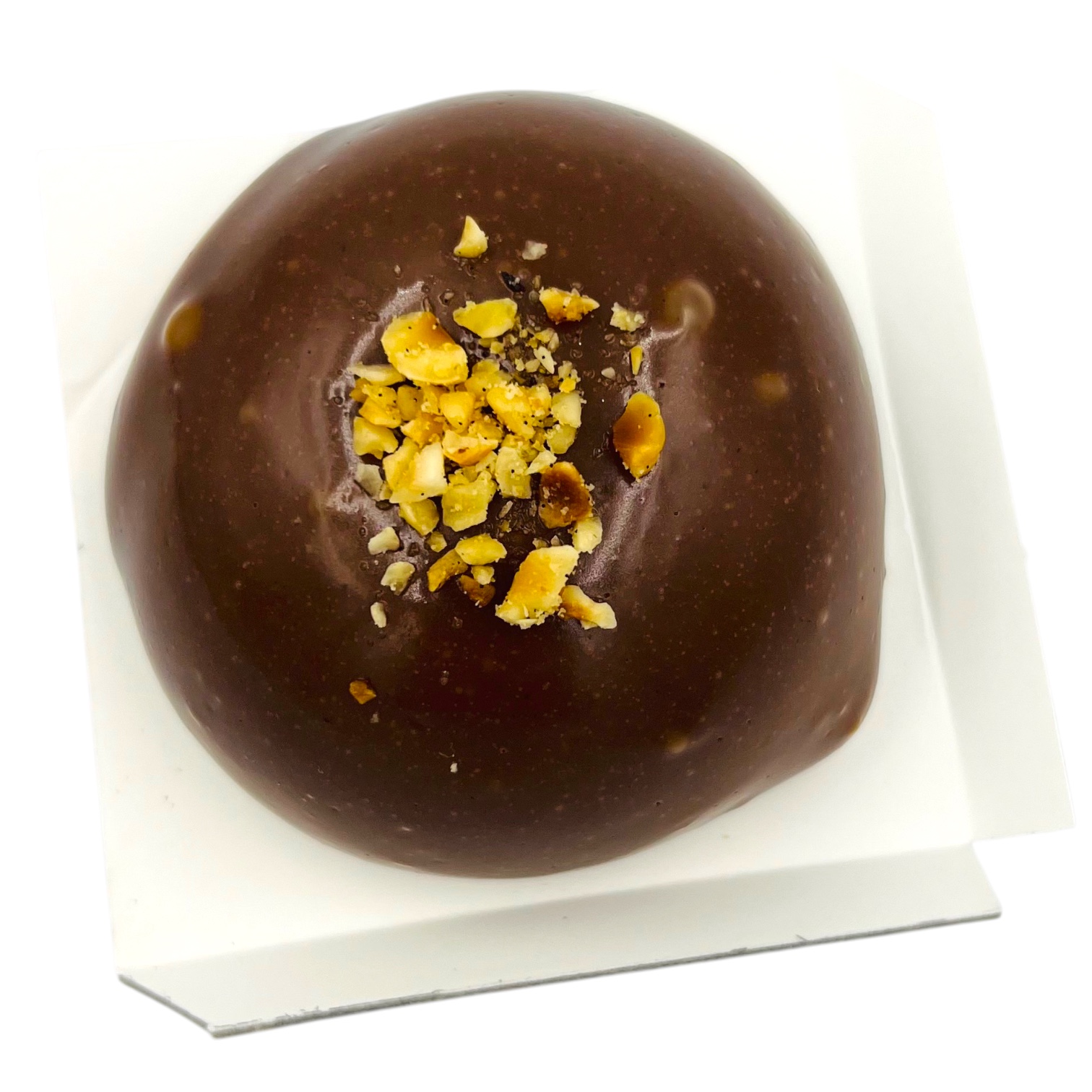 Mousse chocolat noir, insert caramel cacahuètes, biscuit sans farine cacao (sans gluten)
